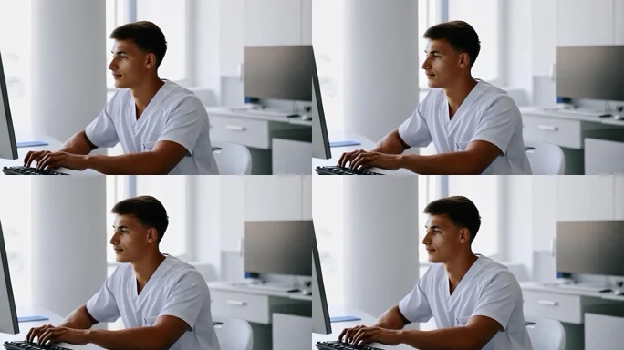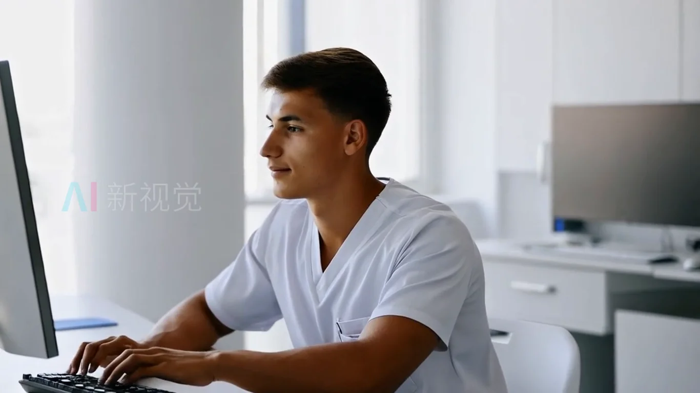 首页 / 视频素材 / AI视频素材(横屏) / 一位青年电脑面前工作