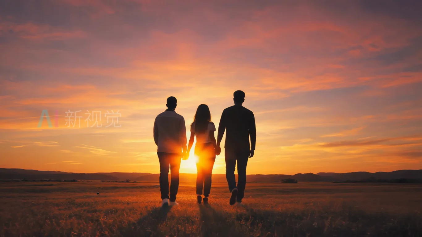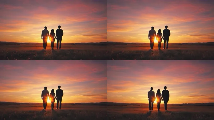 三人夕阳下田野漫步
