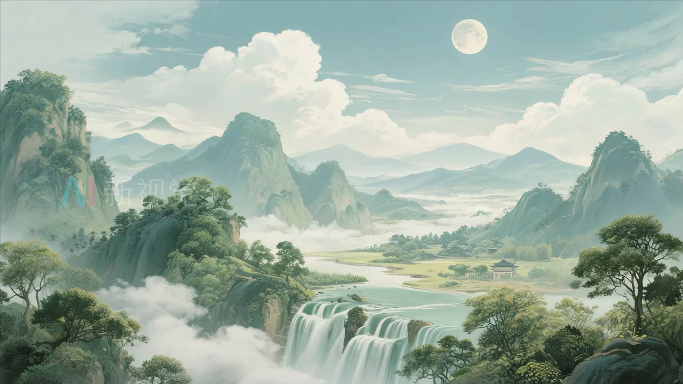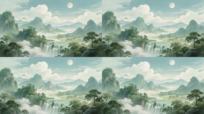 中式山水月夜风景