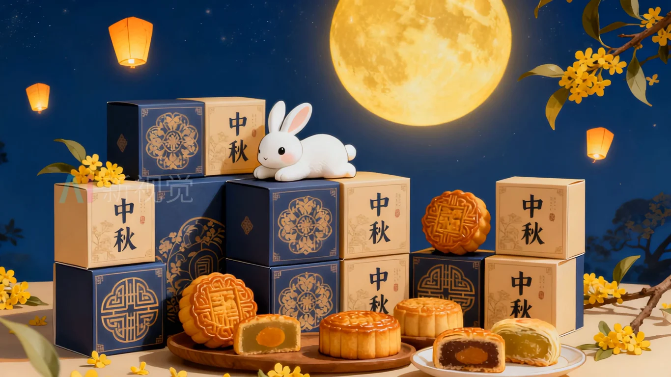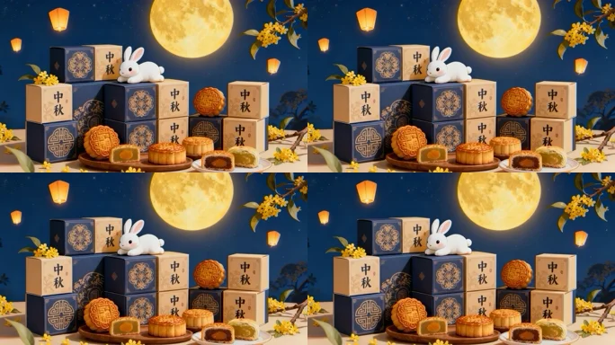 首页 / 视频素材 / AI视频素材(横屏) / 中秋月饼礼盒与白兔装饰画面