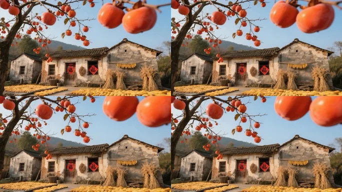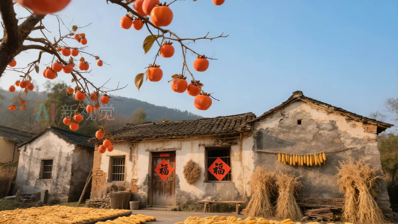 首页 / 视频素材 / AI视频素材(横屏) / 乡村农舍前晾晒玉米柿子景象