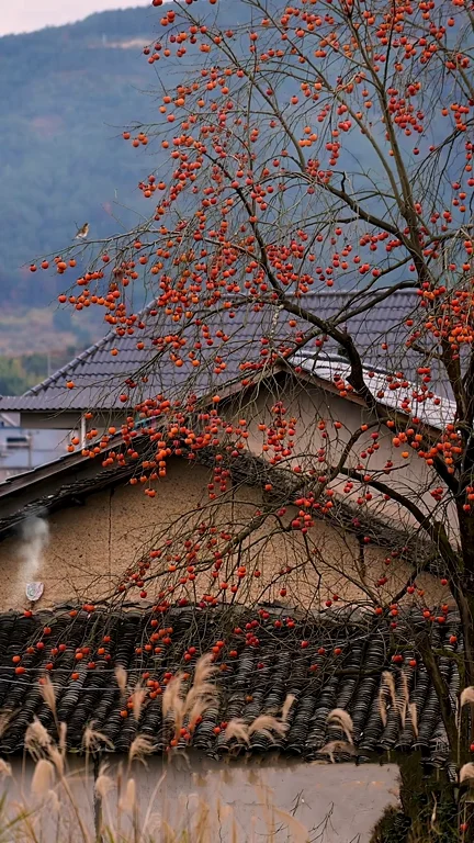 乡村治愈炊烟乡愁柿子树鸟叫农村家乡