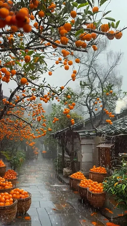 乡村治愈炊烟乡愁柿子树鸟叫农村家乡雨景秋天收获2