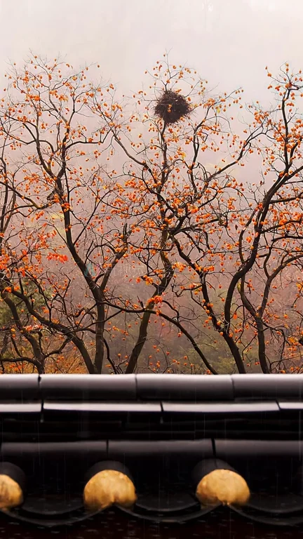 乡村治愈炊烟乡愁柿子树鸟叫农村家乡雨景秋天收获3