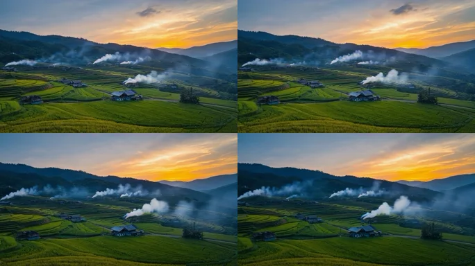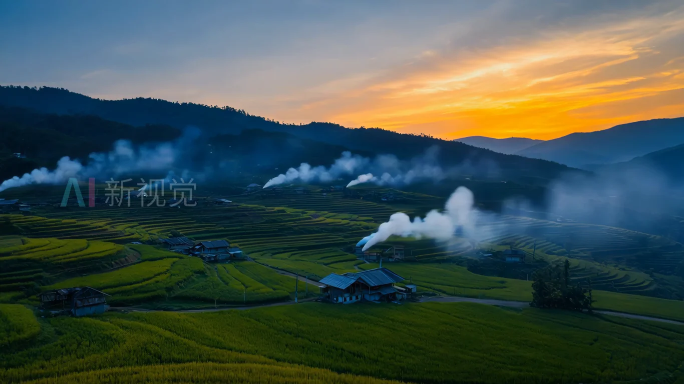乡村稻田与民居黄昏景致