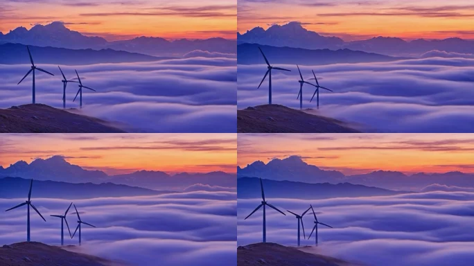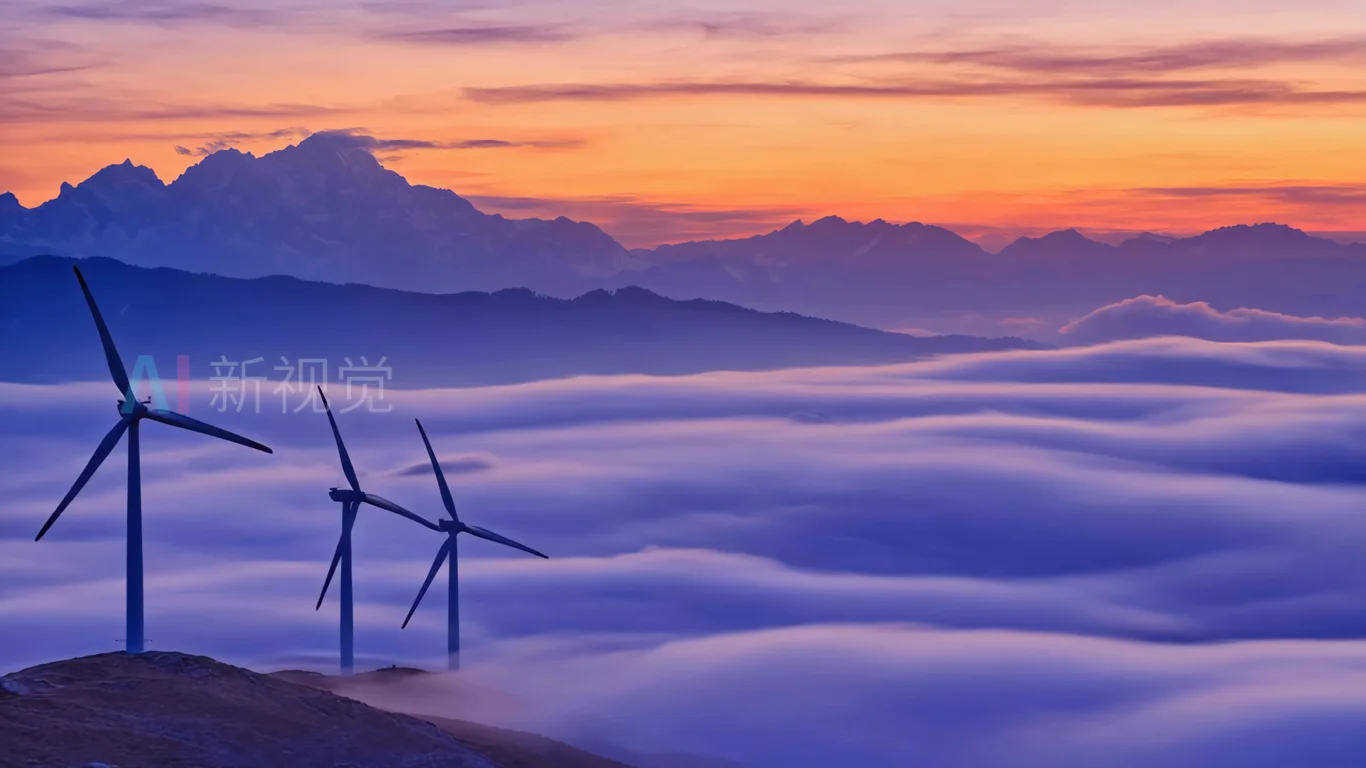 首页 / 视频素材 / AI视频素材(横屏) / 云海中的风力发电机日落景象