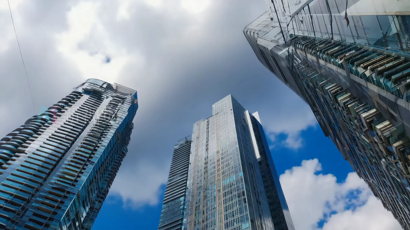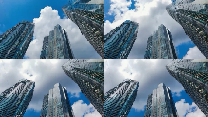首页 / 视频素材 / AI视频素材(横屏) / 仰拍现代摩天大楼与蓝天延时