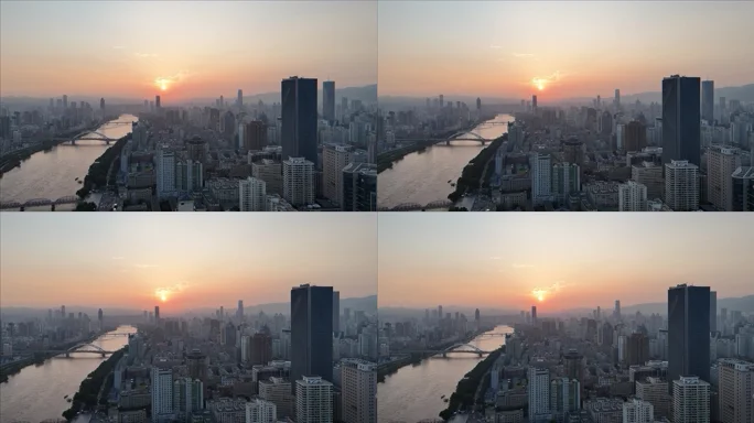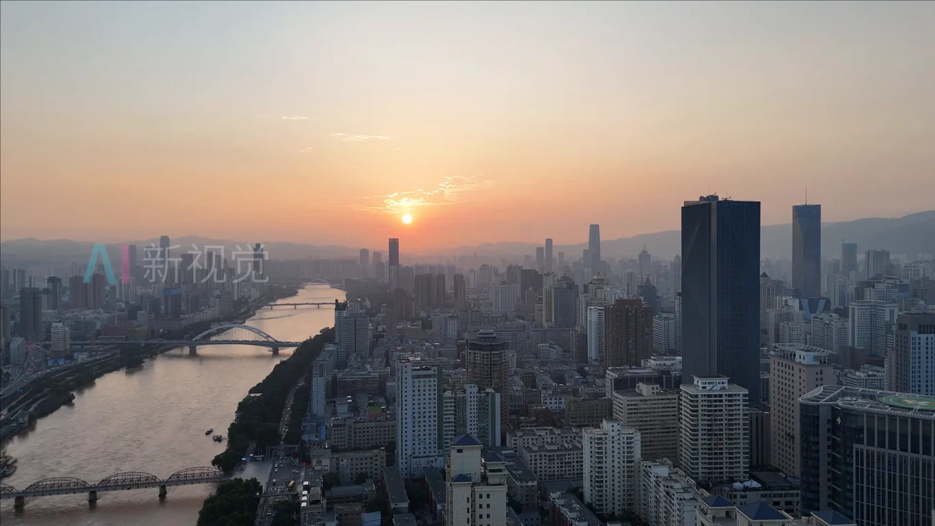 兰州黄河畔城市日落航拍