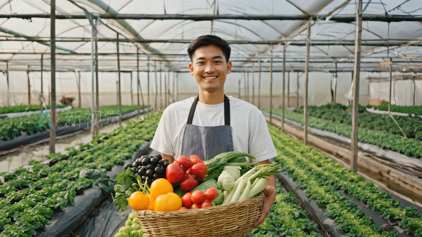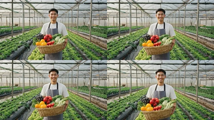 农民温室持篮展示新鲜蔬微笑