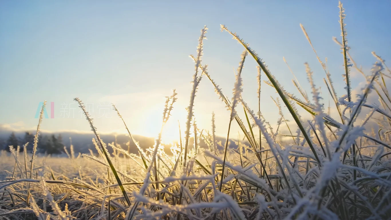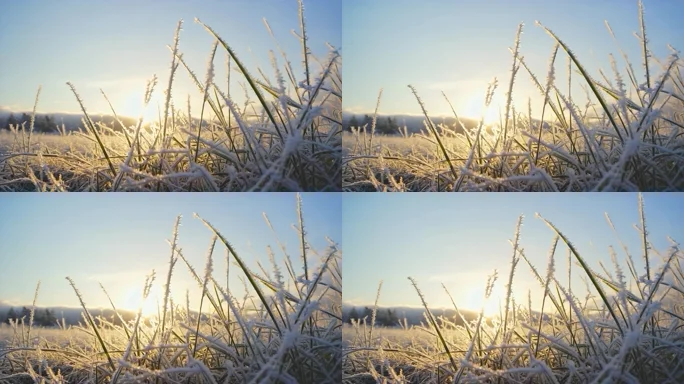 冬日清晨覆霜野草与日出景象