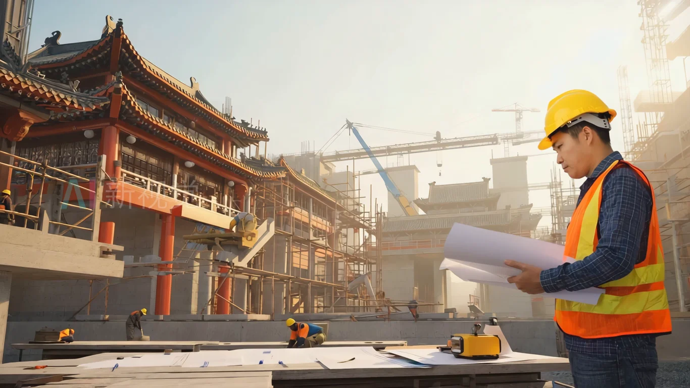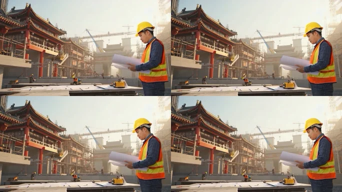 古建筑工地工程师查看图纸
