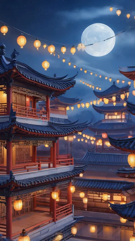 首页 / 视频素材 / AI短视频素材(竖屏) / 古风建筑月夜灯笼景观