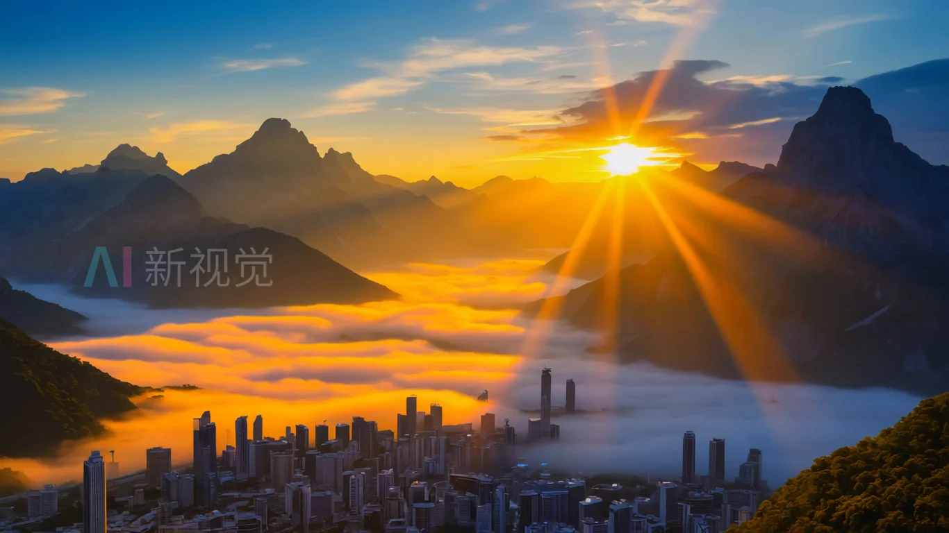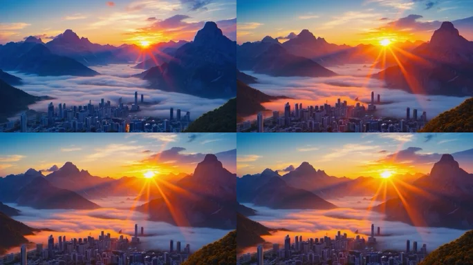首页 / 视频素材 / AI视频素材(横屏) / 城市与山脉云海日出延时