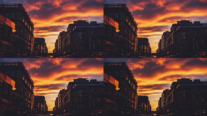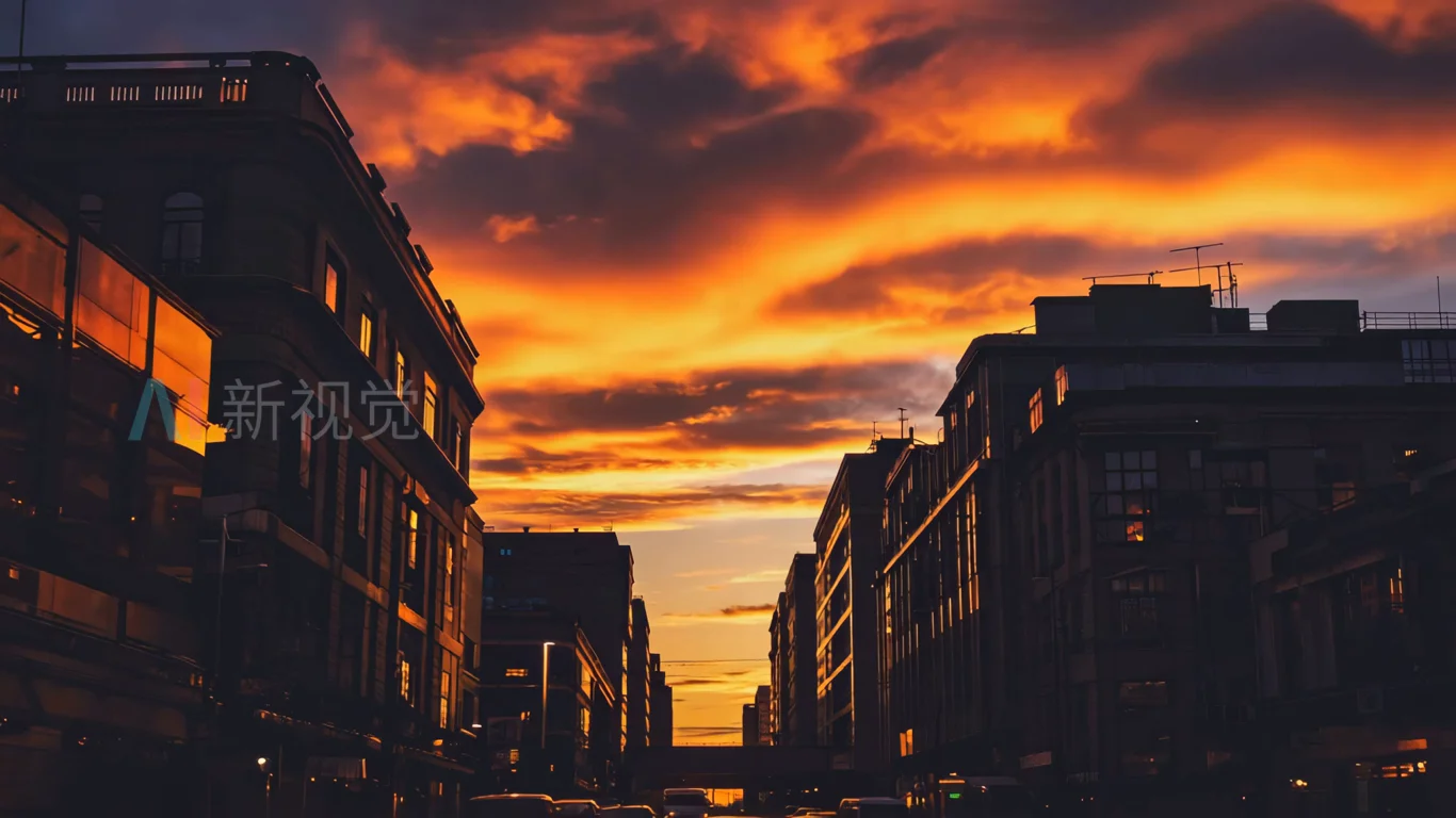 首页 / 视频素材 / AI视频素材(横屏) / 城市建筑间的晚霞景色