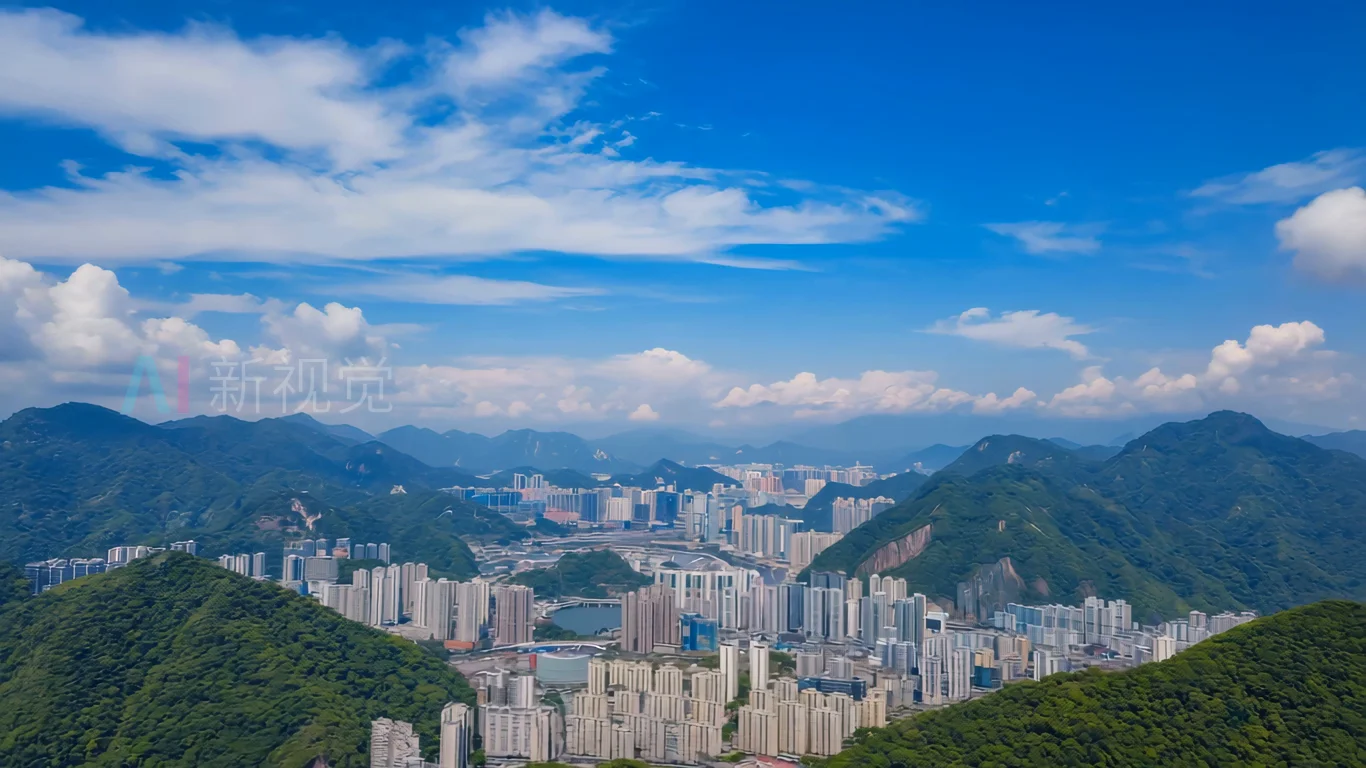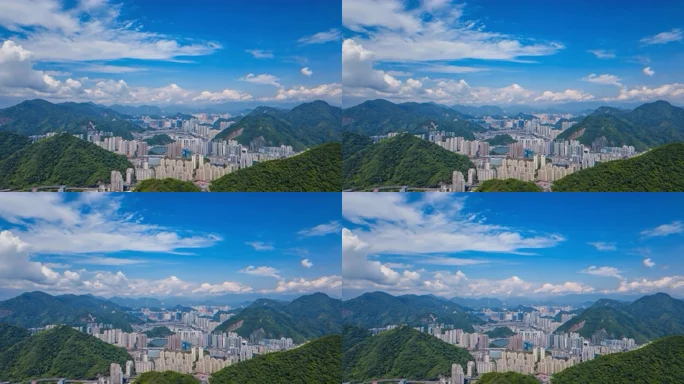 城市高楼与远山蓝天白云景观