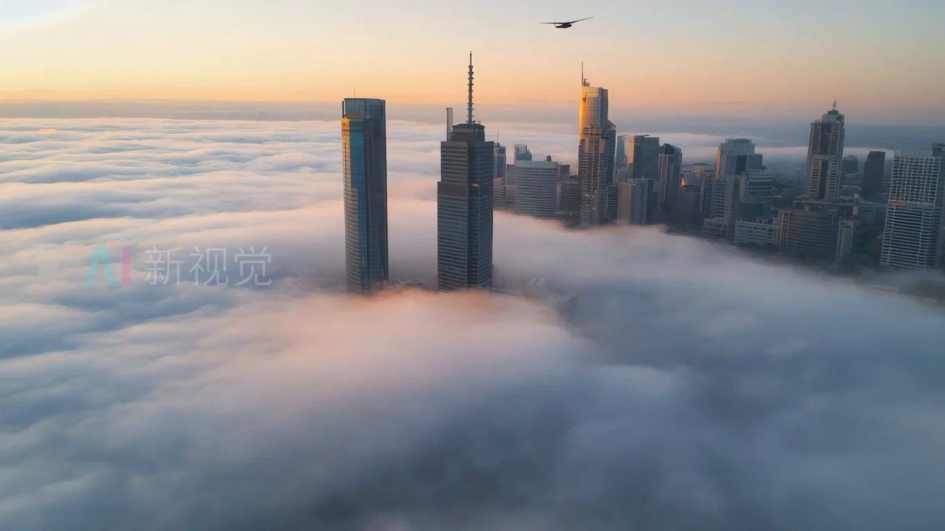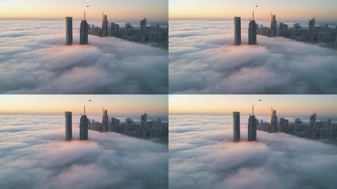 首页 / 视频素材 / AI视频素材(横屏) / 城市高楼云海之上航拍景象
