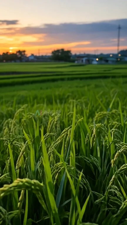 夕阳下的绿色稻田