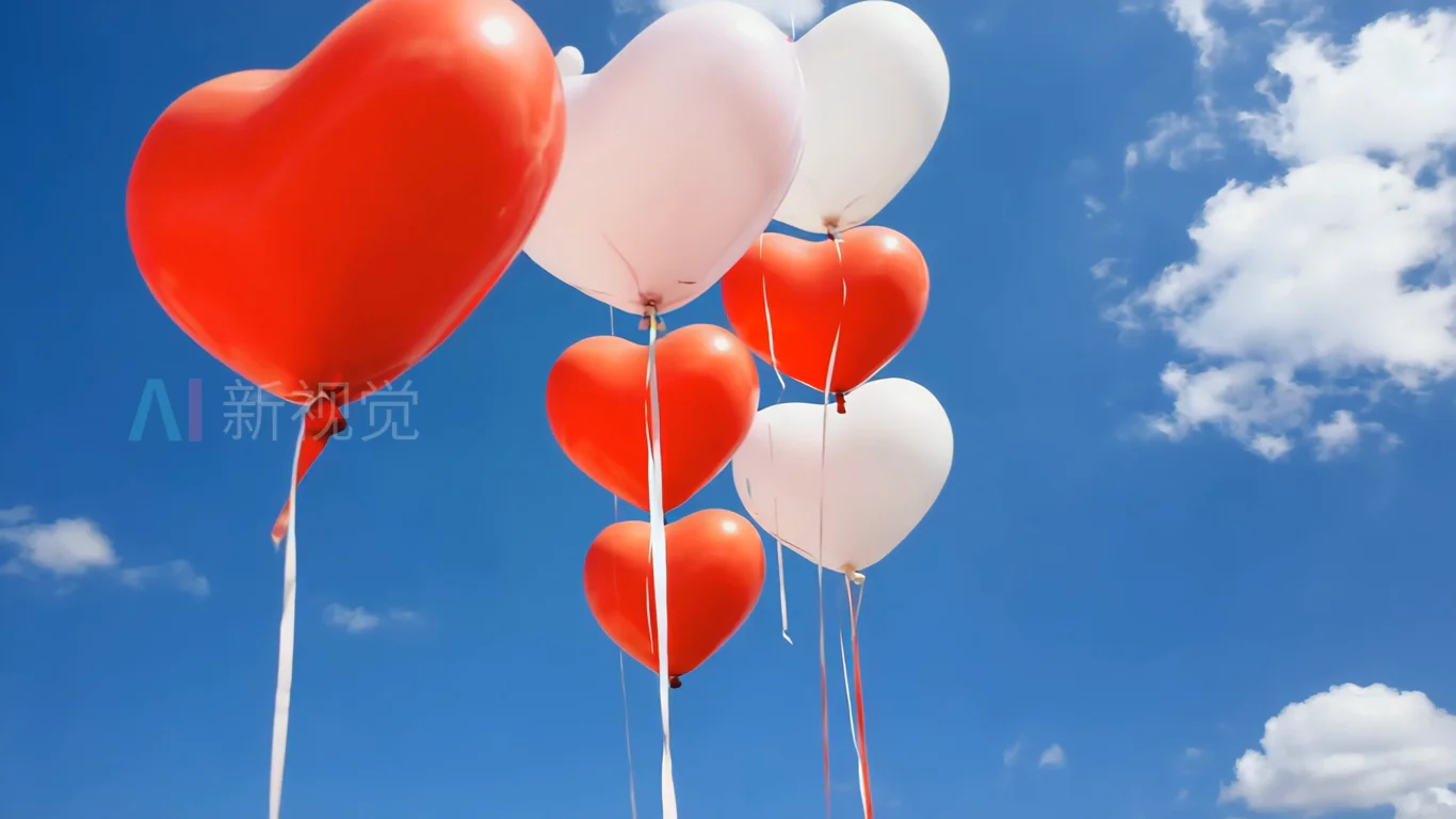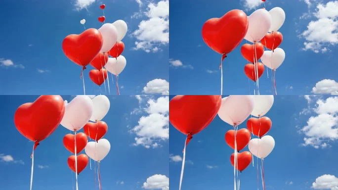 首页 / 视频素材 / AI视频素材(横屏) / 天空中的心形气球特写