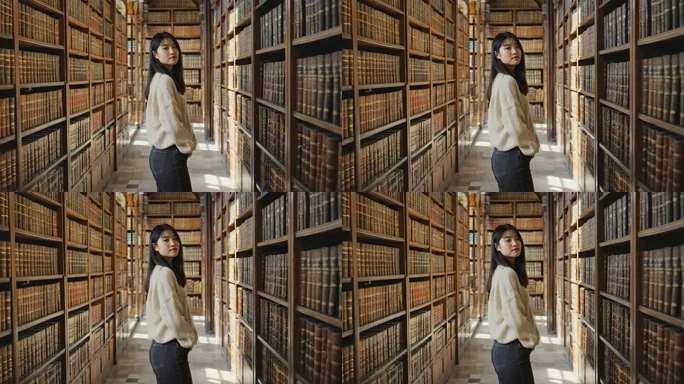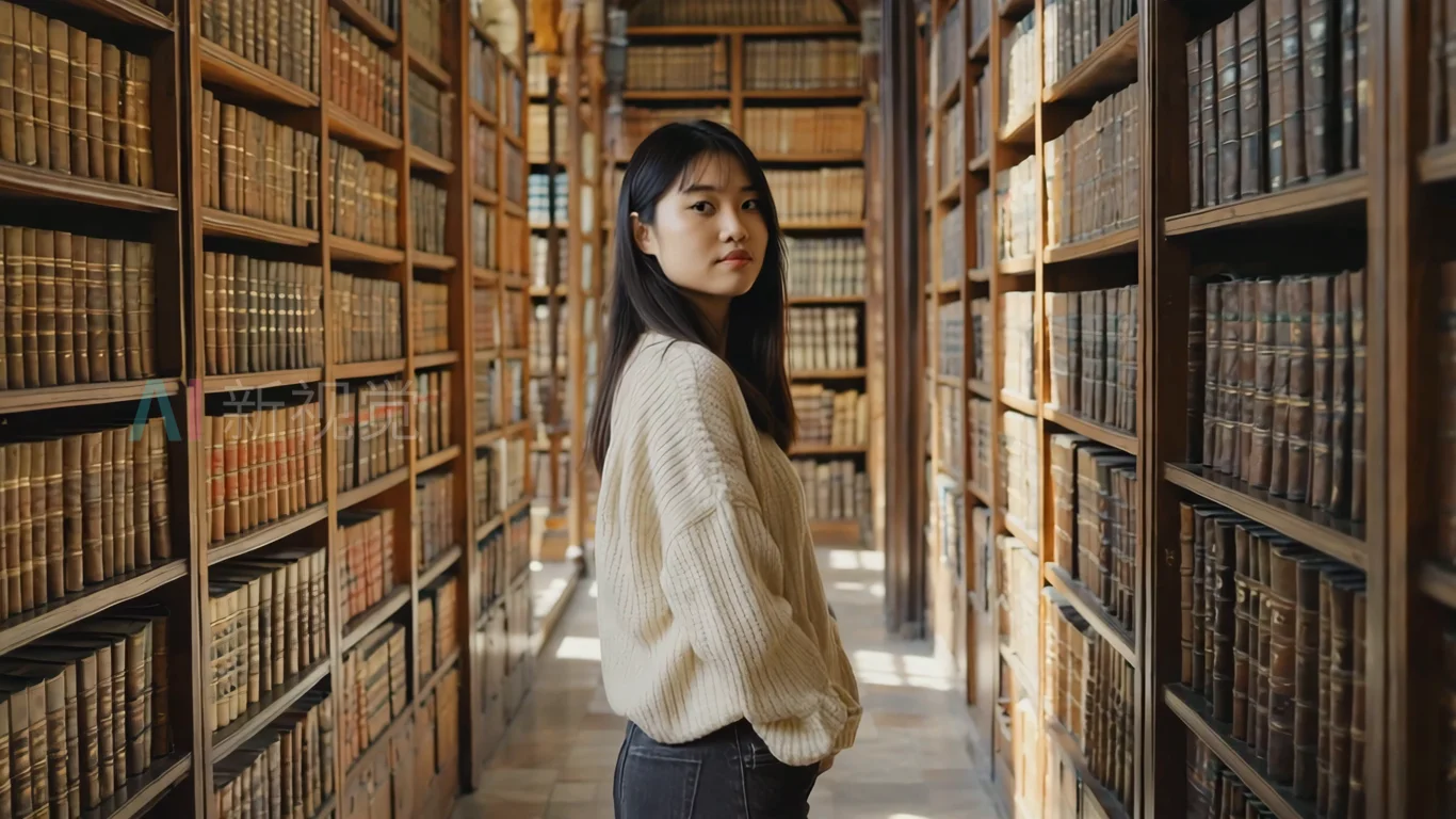 首页 / 视频素材 / AI视频素材(横屏) / 女孩在图书馆过道站立