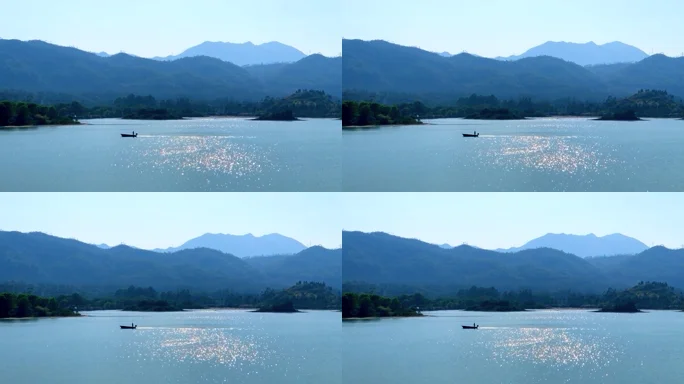 一个人划着船行驶在如画的山水之间