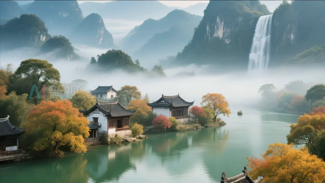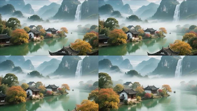 首页 / 视频素材 / AI视频素材(横屏) / 山水间中式古建筑风景