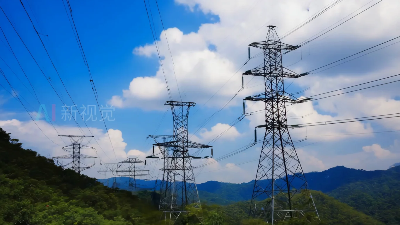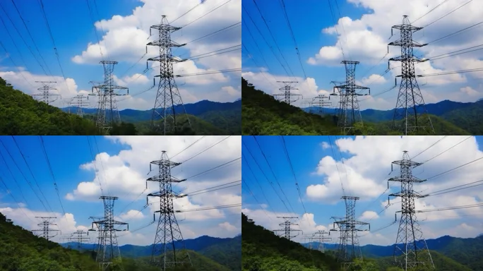 山间输电电塔与蓝天白云景观