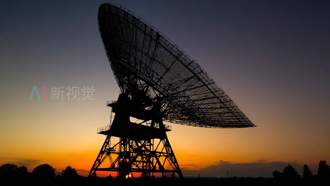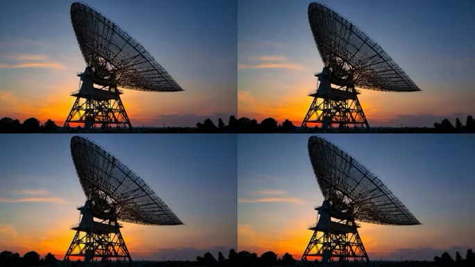 日落时分的大型卫星天线