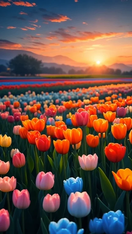 首页 / 视频素材 / AI短视频素材(竖屏) / 日落时分郁金香花田美景