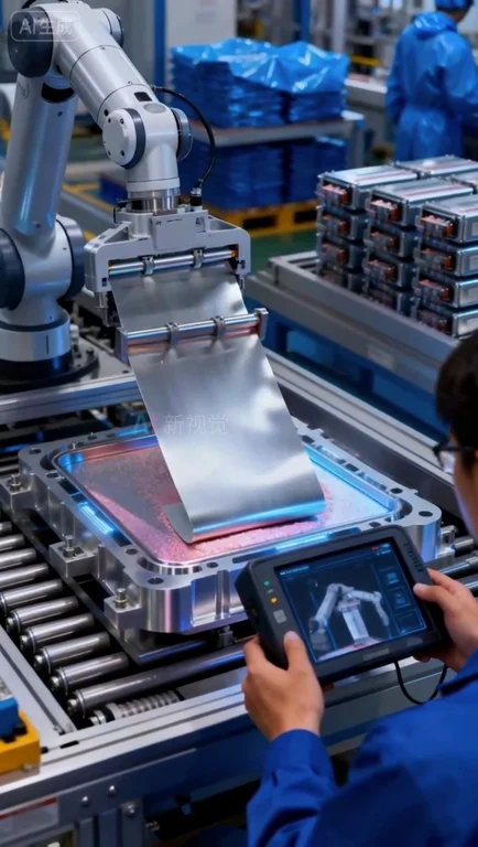 稀土, 电池生产, 自动化产线, 机械臂, 锂电材料, 新能源制造, 智能制造, 粉色粉体(稀土原料), 工业4.0, 电池组装