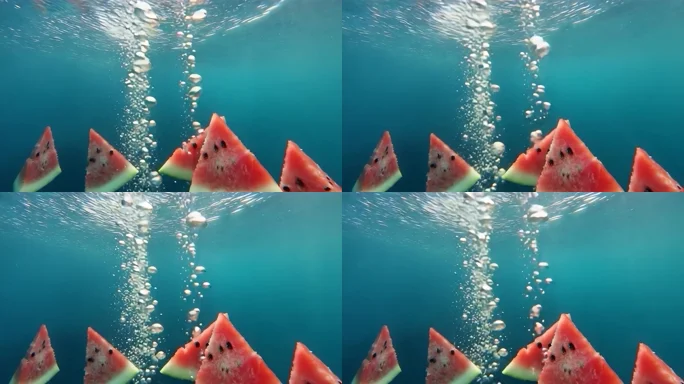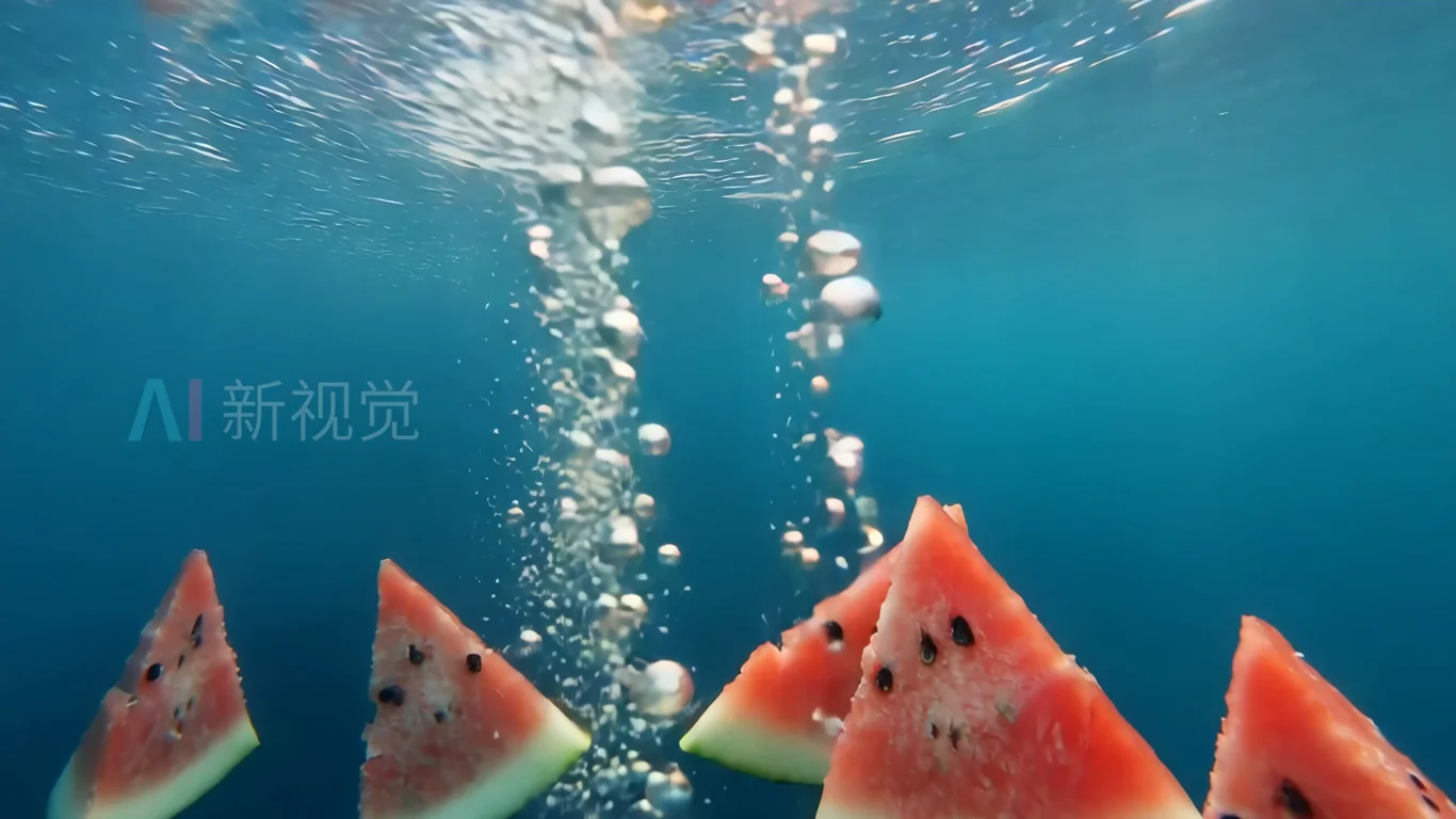 首页 / 视频素材 / AI视频素材(横屏) / 水中漂浮的西瓜切片