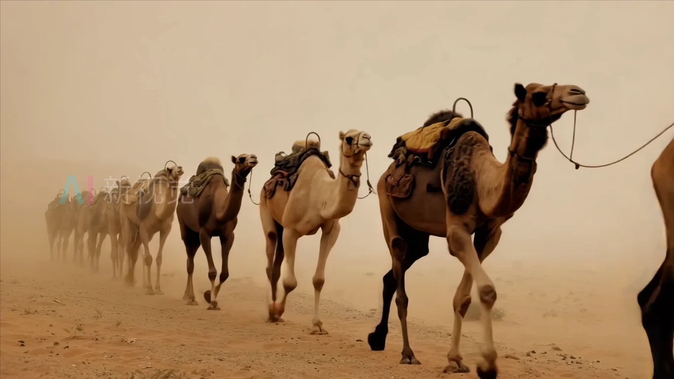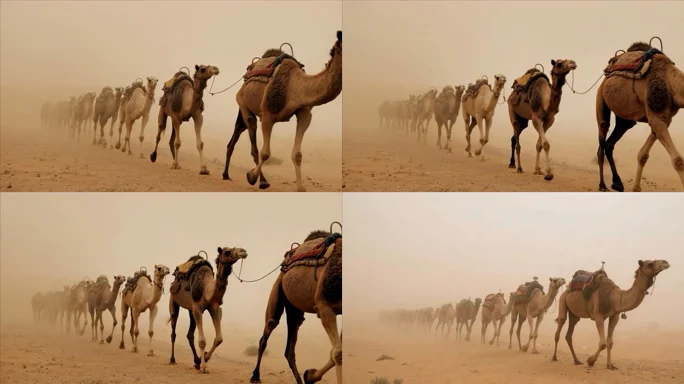 沙漠中骆驼队行进画面
