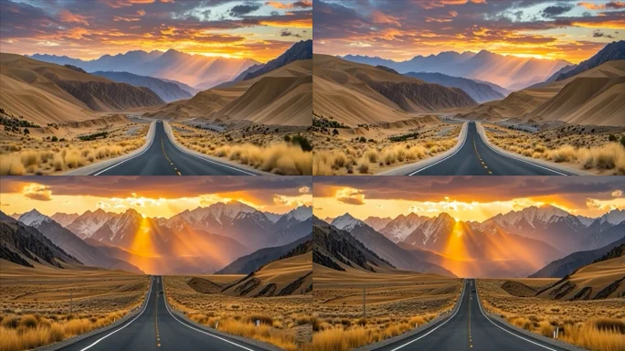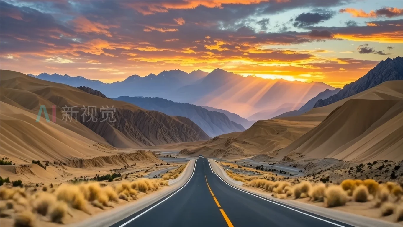 首页 / 视频素材 / AI视频素材(横屏) / 沙漠公路日落自然风光素材