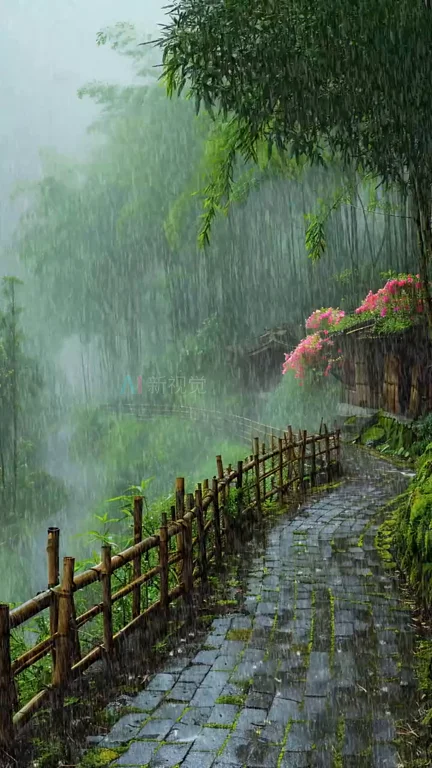 治愈系美景树林情境小路雨景雨夜孤独朦胧红花