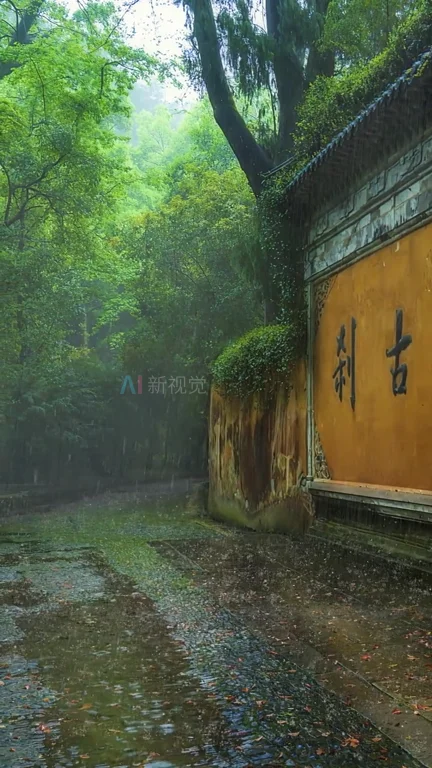 治愈美景寺庙古树雨景