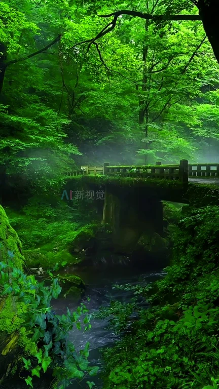 治愈美树林夏天鸟叫山林小溪溪水石桥摇镜头水流