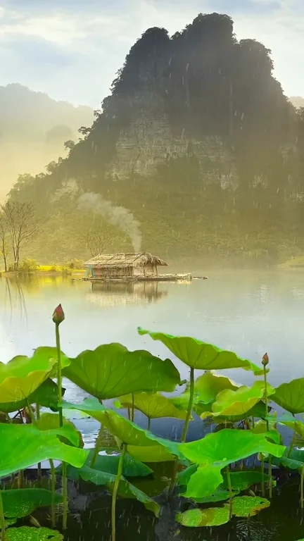 治愈雨景荷花美景山水画水墨画夏天夏景