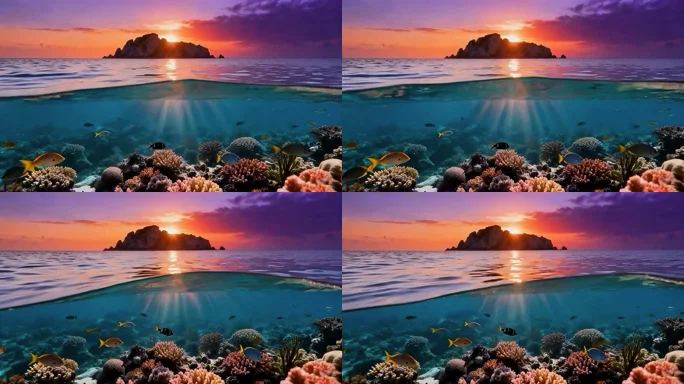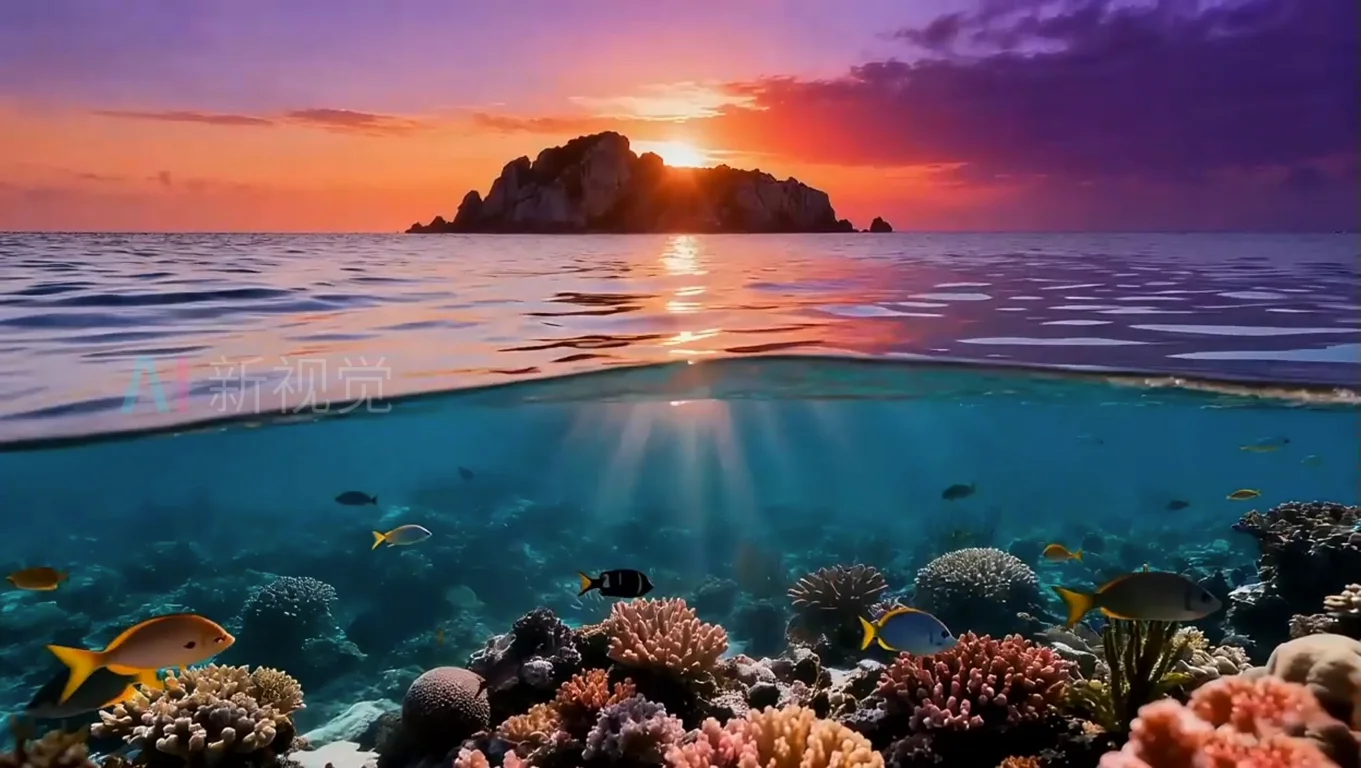 将海洋日落的动态美淋漓展现。海水波纹纹路清晰,随浪潮自然起伏,镜头也模拟海浪晃动的韵律,带来沉浸式的海上观感;色彩鲜亮的海鱼灵动且缓慢地穿梭在珊瑚间,姿态逼真自然;同时,夕阳缓缓西沉,天空的暖色调随时间推移渐变加深,阳光在海面与水下的光影同步流转变化,把海洋日落时分的浪漫氛围感与海底生机的流动感,细腻且连贯地编织进画面里,宛如一场海洋与光影共舞的诗意展演。