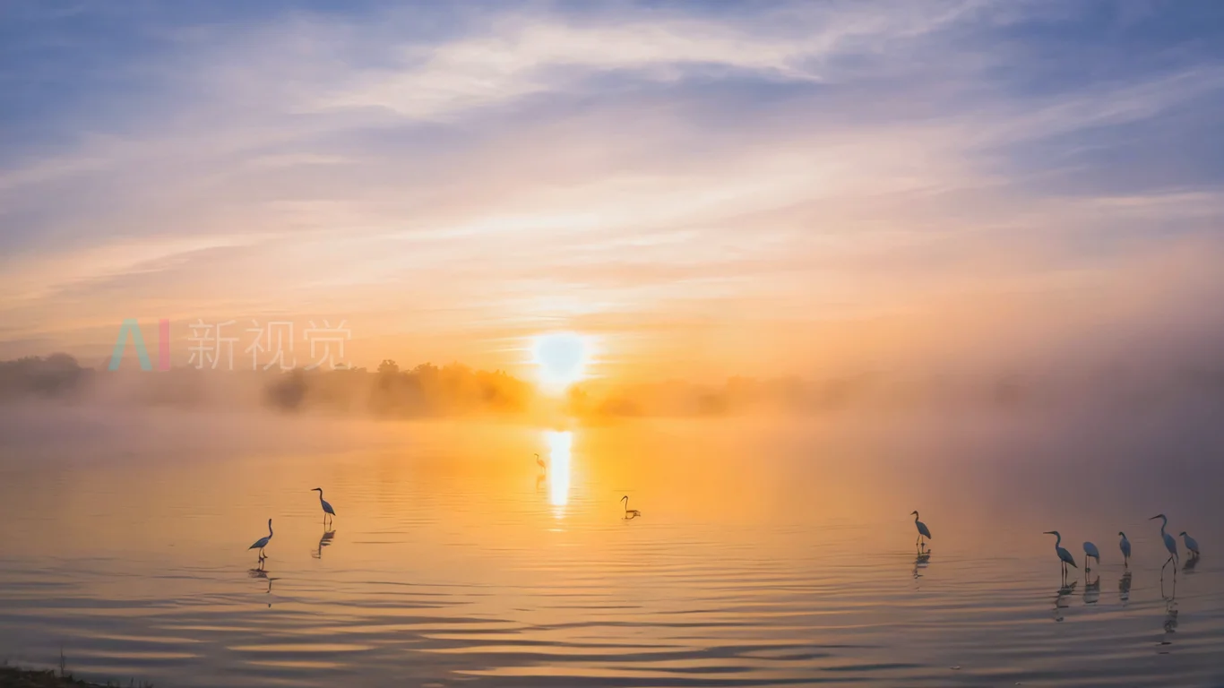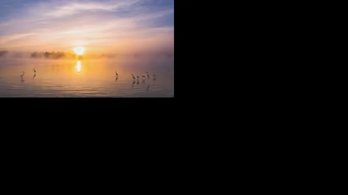 湖面飞鸟与晨雾森林景观