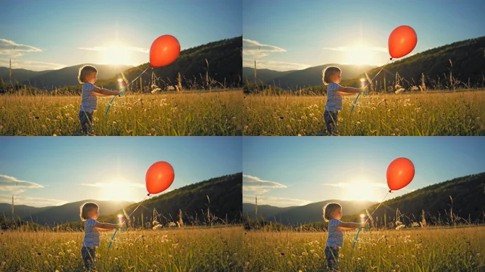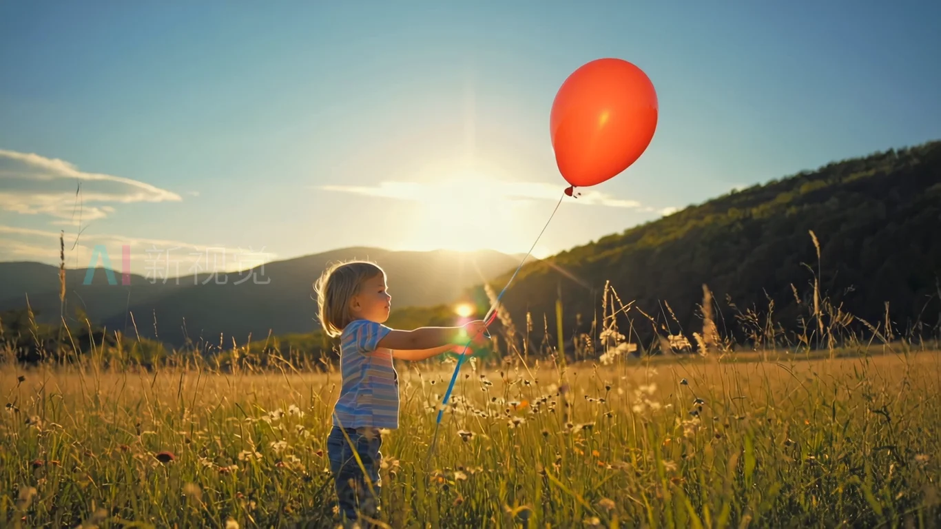 首页 / 视频素材 / AI视频素材(横屏) / 田野中孩子牵红色气球