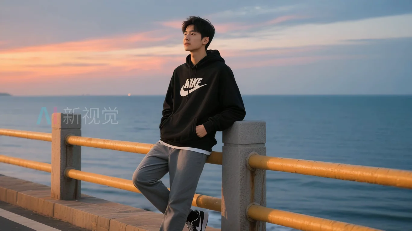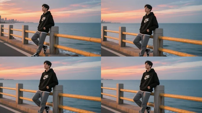 首页 / 视频素材 / AI视频素材(横屏) / 男子倚栏眺望海边城市风景