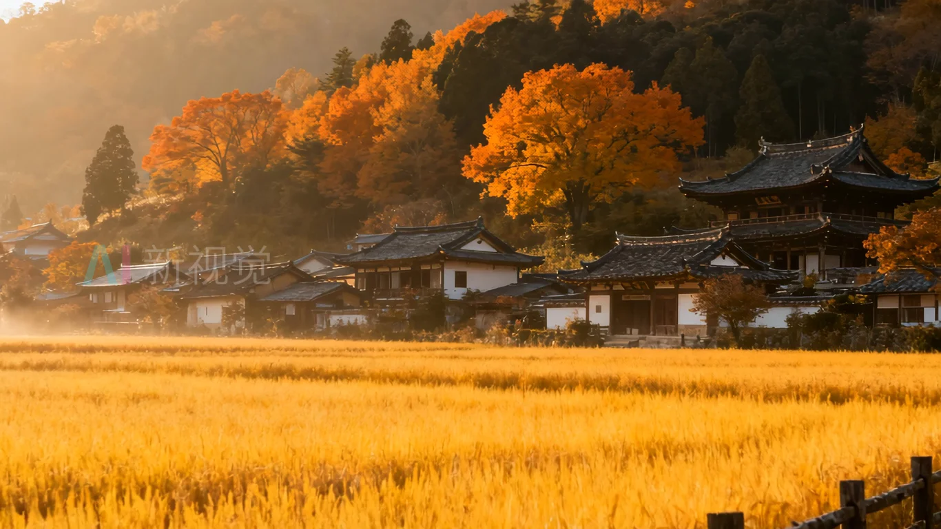 秋日乡村稻田与古建筑风景