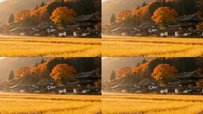 首页 / 视频素材 / AI视频素材(横屏) / 秋日乡村稻田与古建筑风景