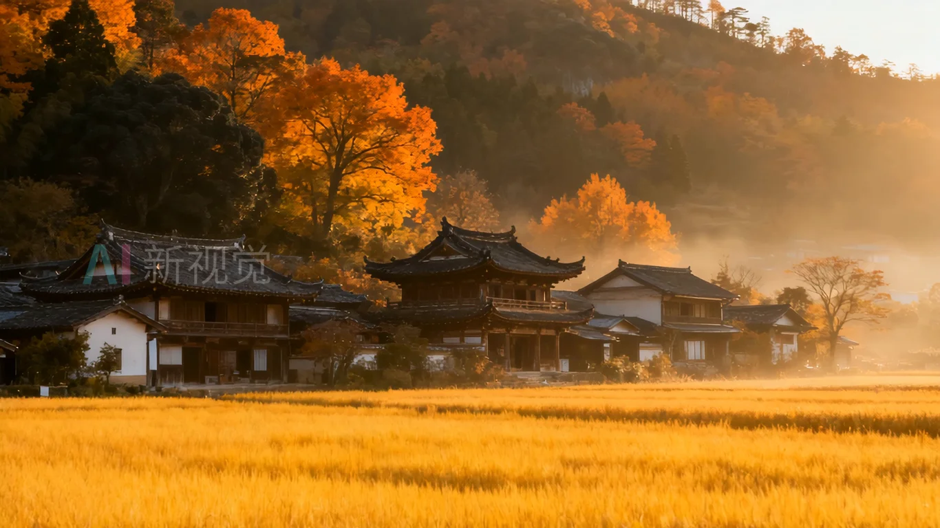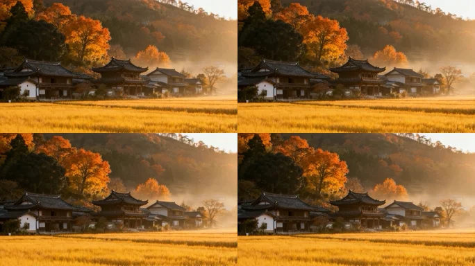 秋日乡村稻田与古建筑风景