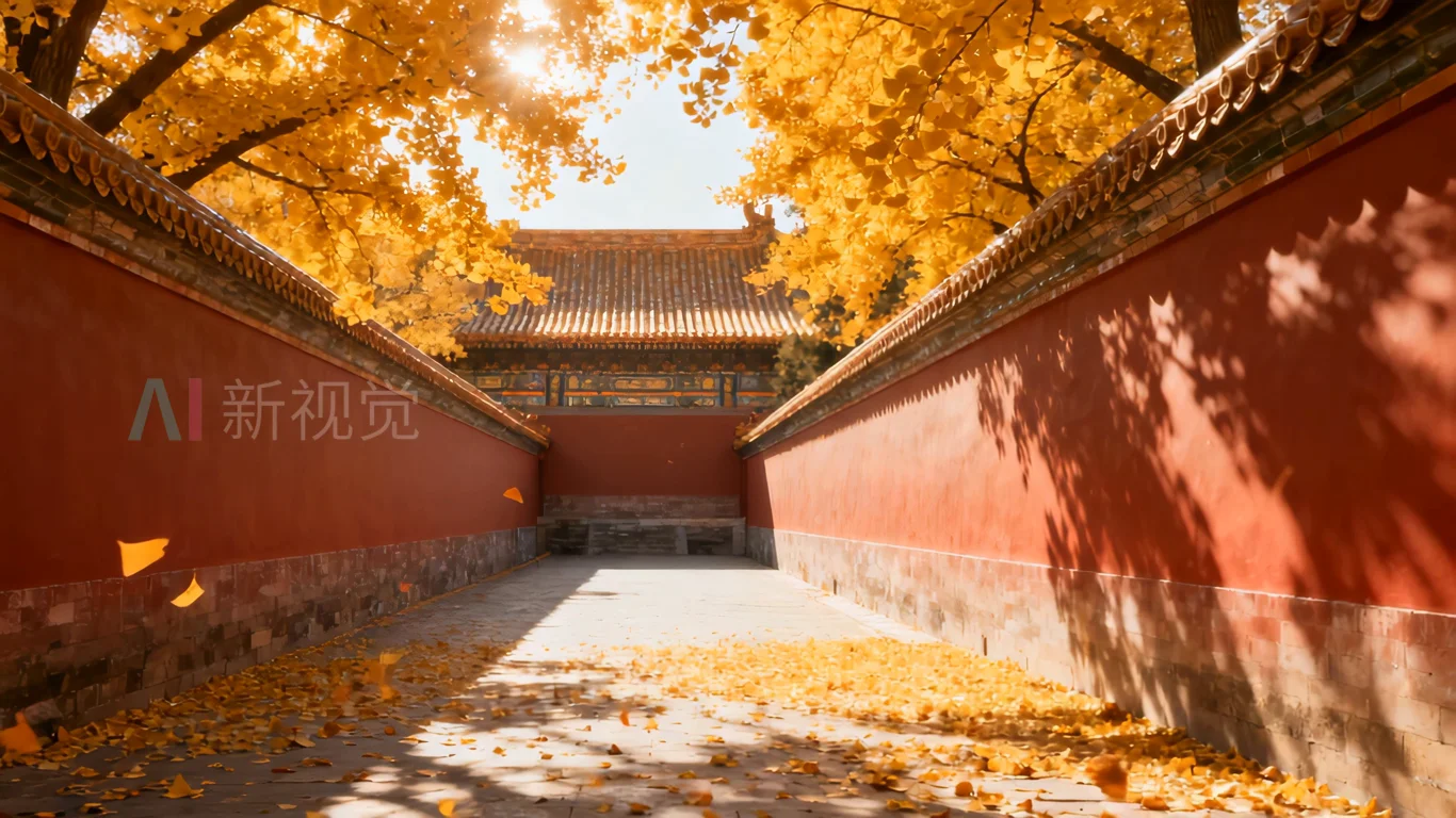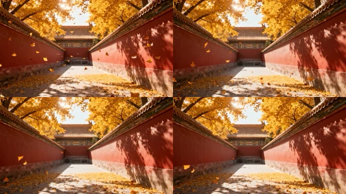 秋日红墙落叶景象