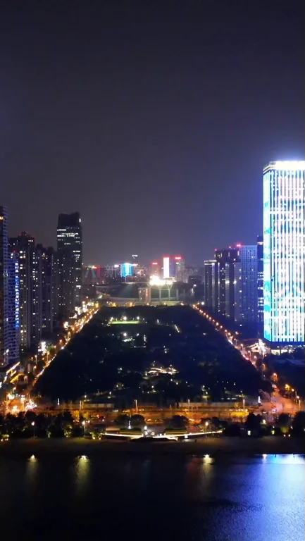 首页 / 视频素材 / 实拍短视频素材(竖屏) / 竖版航拍安徽合肥天鹅湖绿轴公园夜景