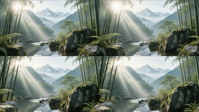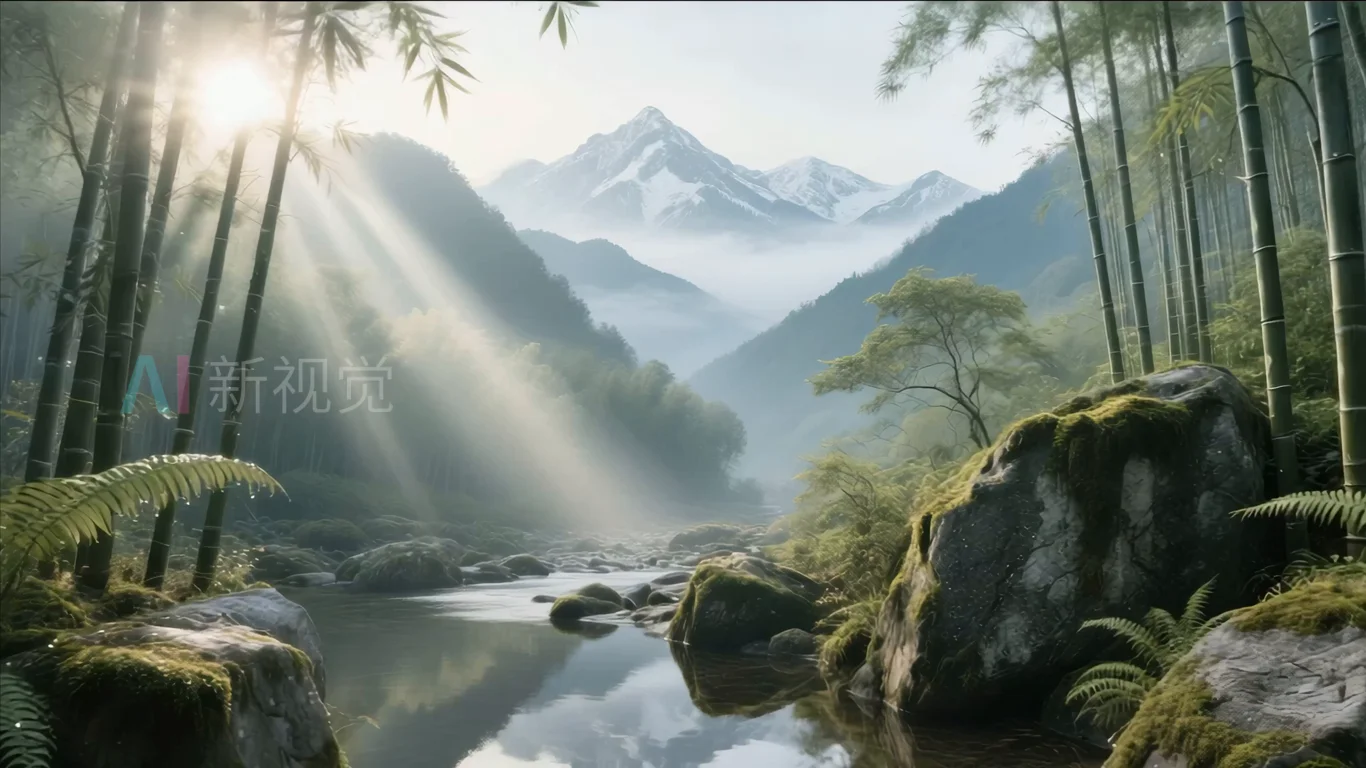 首页 / 视频素材 / AI视频素材(横屏) / 竹林溪流雪山自然风光