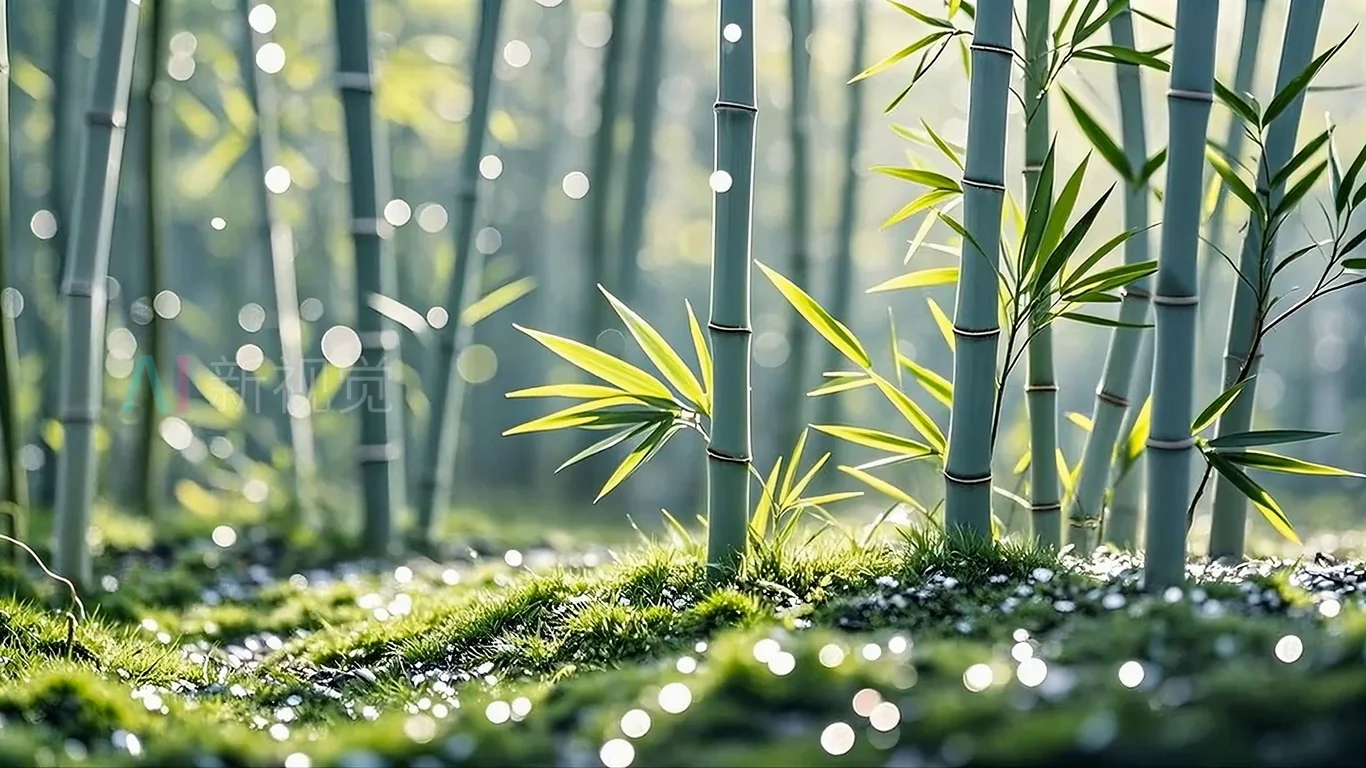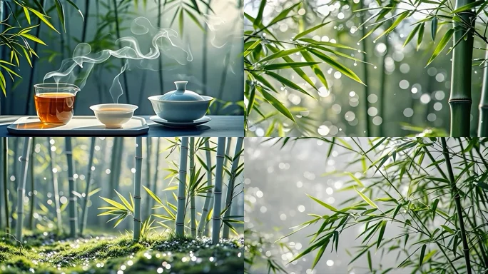 4K,3840*2160,30P,MP4格式 AIGC竹林竹海竹子叶茶中式禅意境风景特写丁达尔光影