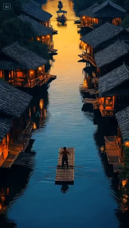 竹楼,村庄,AI风景,水上人家,水上建筑,传统建筑,非遗文化,美学,晚霞