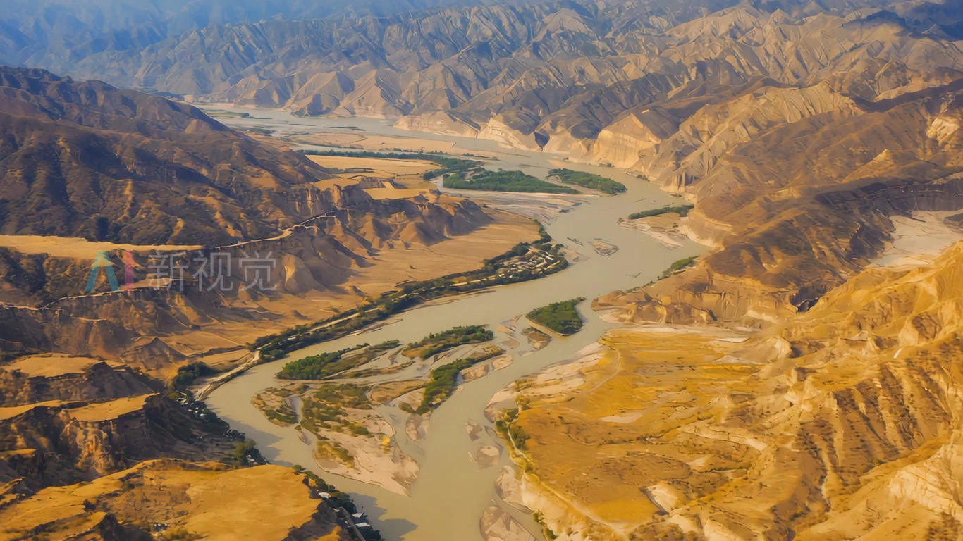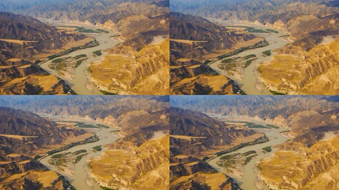 航拍河流穿行山峦全景