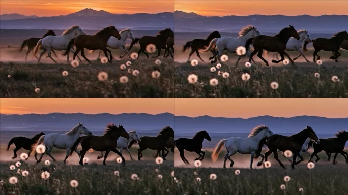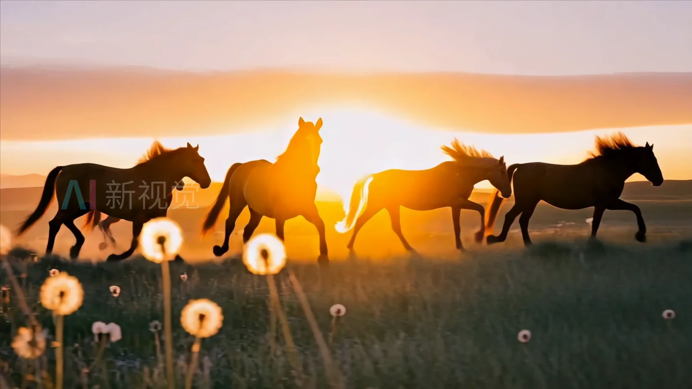 首页 / 视频素材 / AI视频素材(横屏) / 草原上夕阳下奔跑的马群